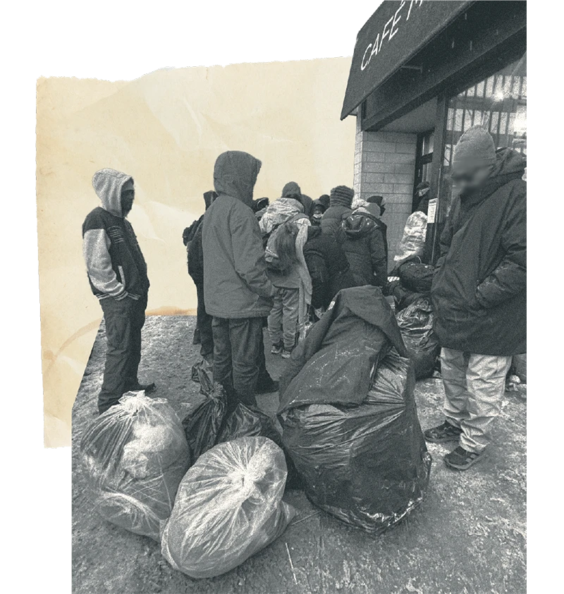 Un gentil bonhomme s’assure que je ne perde pas ma place, un autre me raconte une histoire décousue au sujet d’un sans-abri retrouvé mort d’hypothermie qui avait caché deux cent cinquante mille piastres dans de vieux journaux, un jeune homme me demande si j’ai du speed et un revendeur m’en offre.