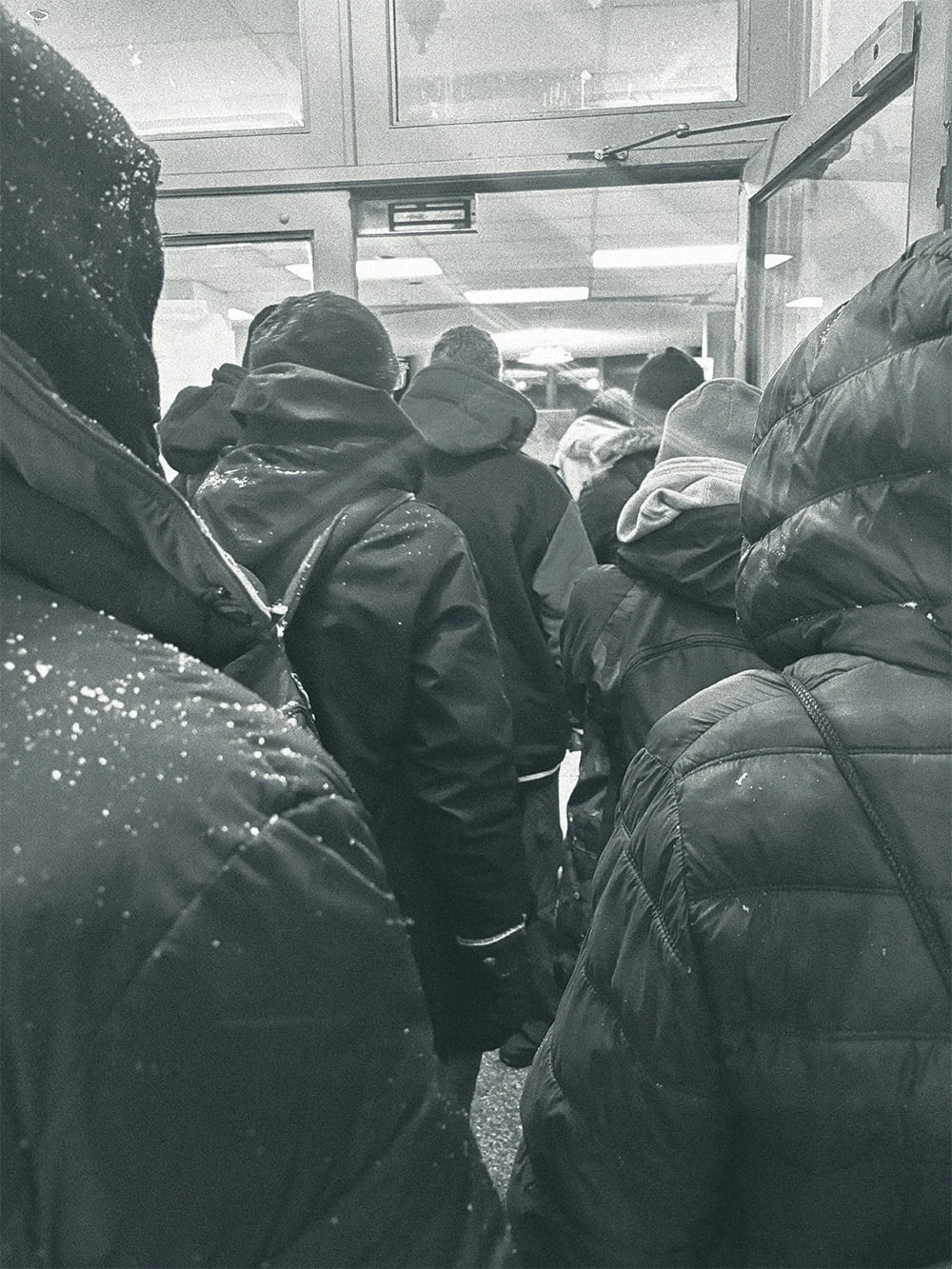 À l’Hôtel-Dieu, la moitié des passagers débarque pour former une nouvelle file devant l’entrée de la halte-chaleur. Le blizzard se met de la partie, on gèle.