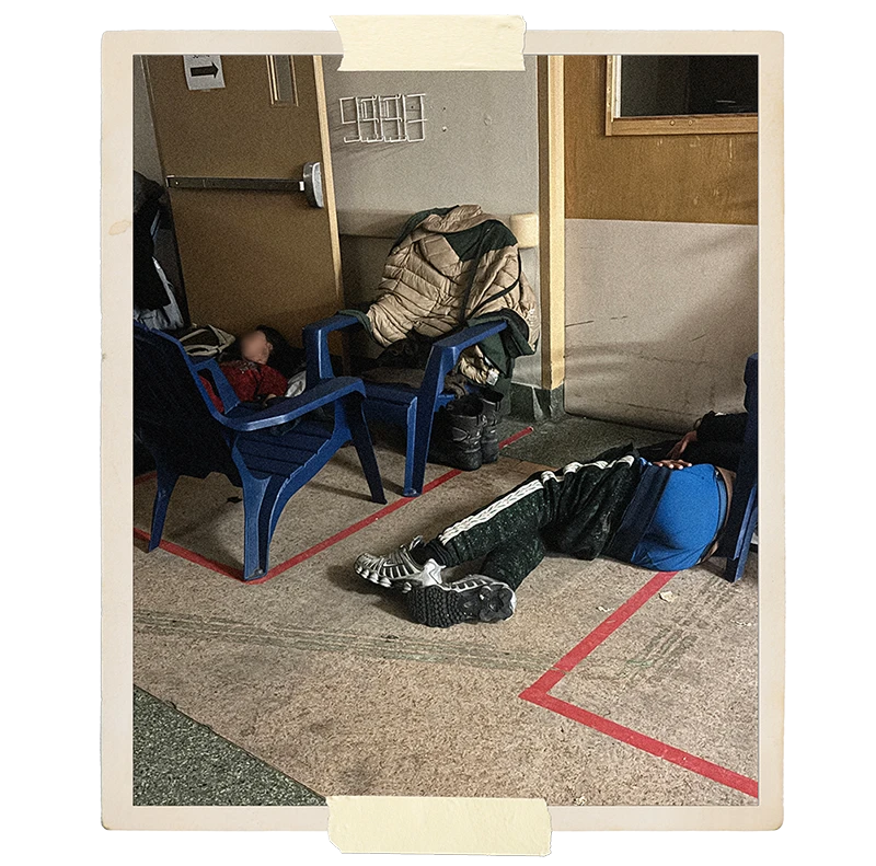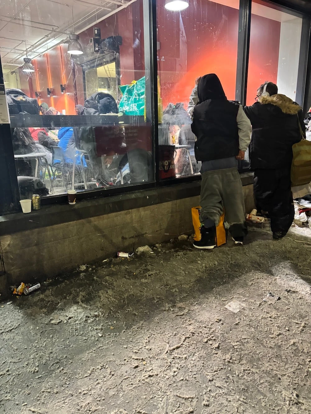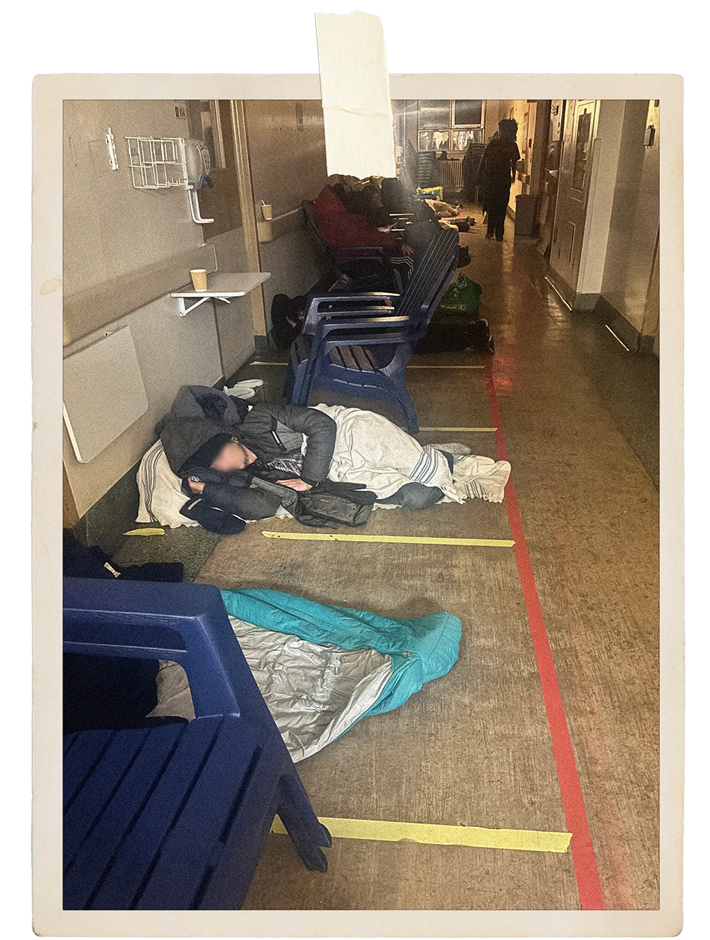 Les gens continuent à entrer. Le YMCA de la rue Stanley serait plein, ce qui explique l’afflux de monde. Il reste une quinzaine de chaises, mais la plupart des gens dorment par terre.