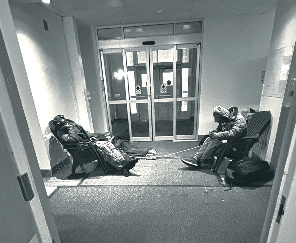 Dehors, je reconnais des visages croisés lors d’une lointaine immersion de trois semaines dans la rue. Les rides se sont creusées, les dos se sont courbés et les cheveux ont grisonné, mais ce sont les mêmes, encore pognés dans le cul-de-sac de l’itinérance.