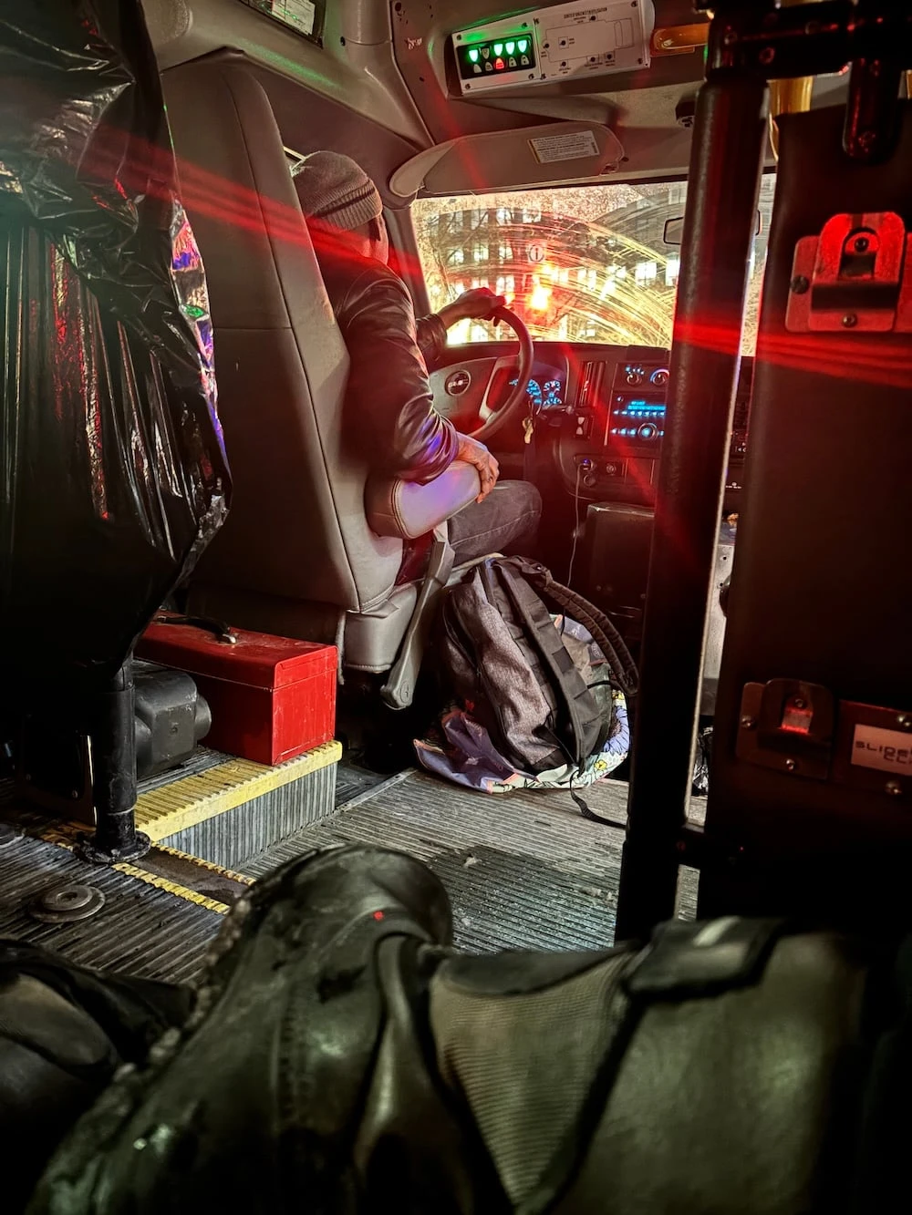 J’apprends que la nouvelle halte-chaleur du Palais de justice est fermée pour la nuit. Un intervenant du café nous invite à grimper à bord de la navette de la Mission, qui fait la tournée des haltes-chaleur.
