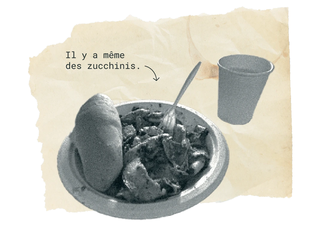 J’ai pas fini de m’installer qu’un gars me tape sur l’épaule. «Tiens, mange! », ordonne-t-il d’un ton paternel. Il me traîne vers la table où se trouve une portion de poulet biryani dans un verre de styromousse. Ses restes à lui, de ce que je comprends. Ça me tente pas full, mais ça vient du fond du cœur, alors je me force et plonge mes doigts dans le verre, faute d’ustensiles.