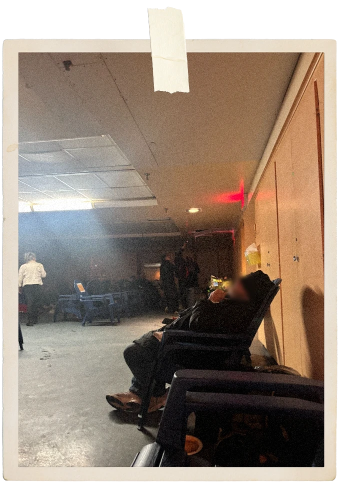 Je signe au bas de la feuille et Francine me fait une visite rapide des lieux. Salle de bain mixte, comptoir où récupérer son repas et fumoir extérieur. « Pour le pot, on préfère à l’extérieur du terrain », souligne-t-elle. On débouche sur la salle où les chaises sont cordées les unes contre les autres. Un lavabo et une table se trouvent au fond, un endroit où brancher les cellulaires, puis that’s it. « As-tu des questions ou des plaintes? », plaisante Francine, adorable, avant de tourner les talons, m’abandonnant devant ma chaise, proche du couloir menant aux toilettes et au fumoir.