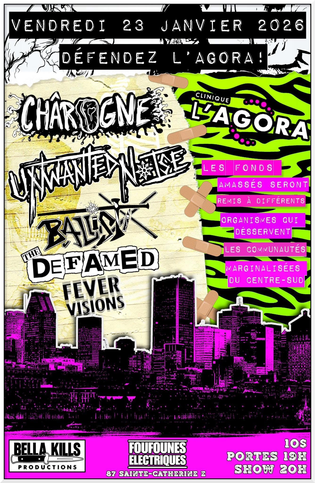 Ça, c’était en novembre dernier, mais il s’est passé tellement de choses depuis qu’on dirait que l’annonce remonte à plus d’un an. Entre-temps, le ministre Dubé est parti, la CAQ a reculé sur la loi 2, mais le sort de la clinique l’Agora demeure en suspens. Le 23 janvier prochain, les groupes Chârogne, The Defamed, Unwanted Noise, Ballistix et Fever Visions grimperont sur les planches du cabaret des Foufounes Électriques pour manifester leur soutien à l’Agora, l’un des derniers remparts contre les failles du système de santé.